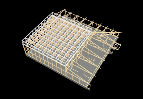 正方形の空間を活かし、光を取り入れた屋根の構造を実現。